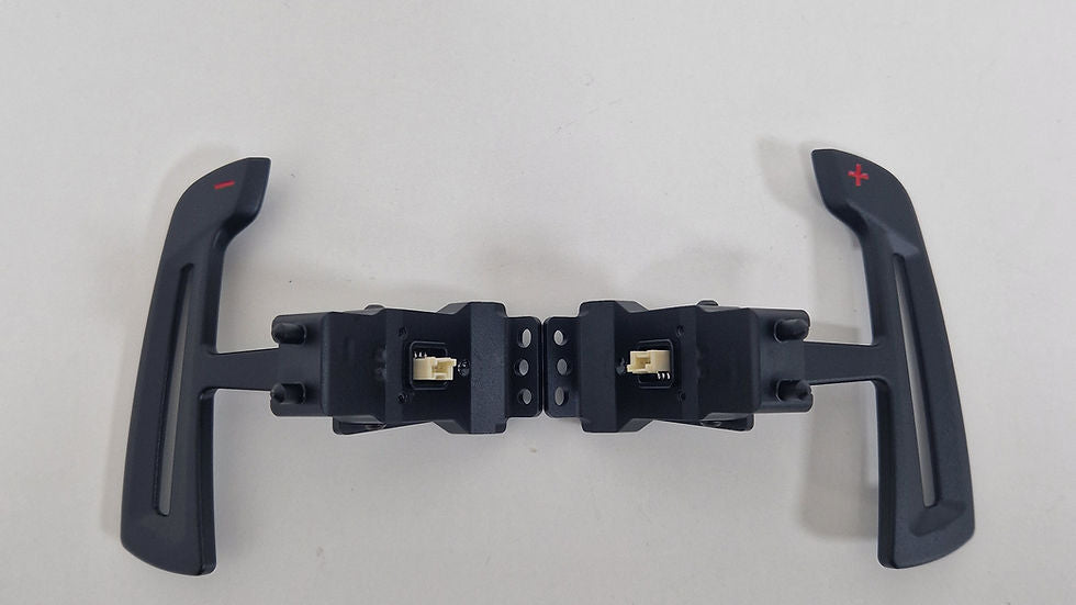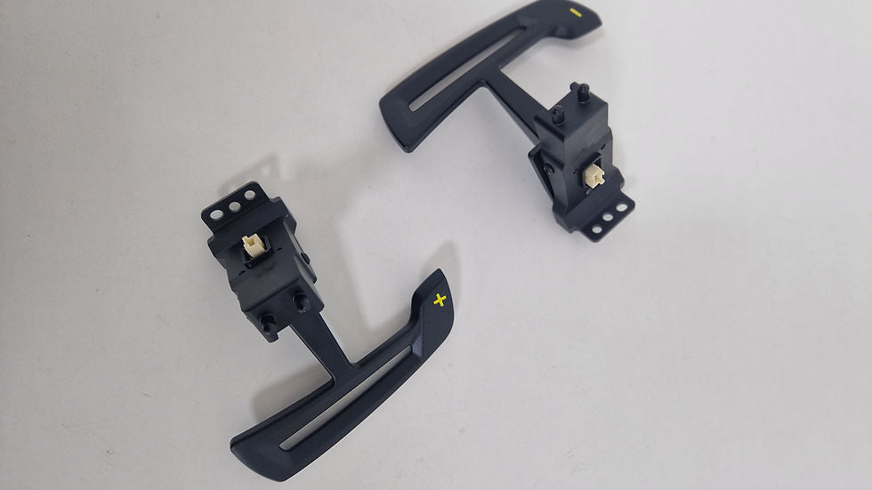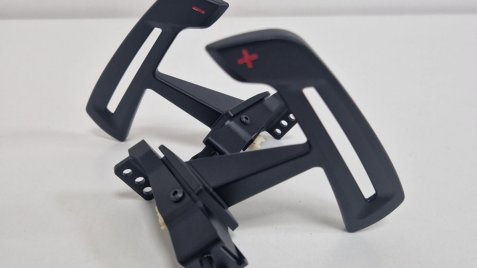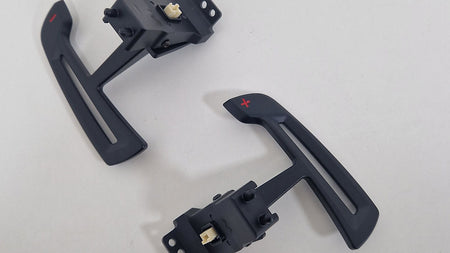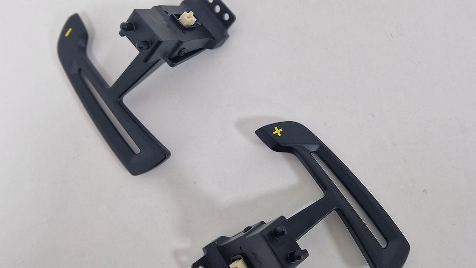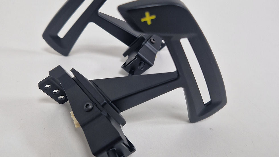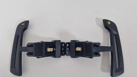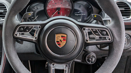 Precise and positive shift feel. The magnetic haptic elements derived from the setup 911 GT3 Cup give them an even crisper force-path curve. They allow a higher operating force and provide precise acoustic feedback for the switching point. The up and down shift icons are highlighted in yellow, red or blue on the paddles.