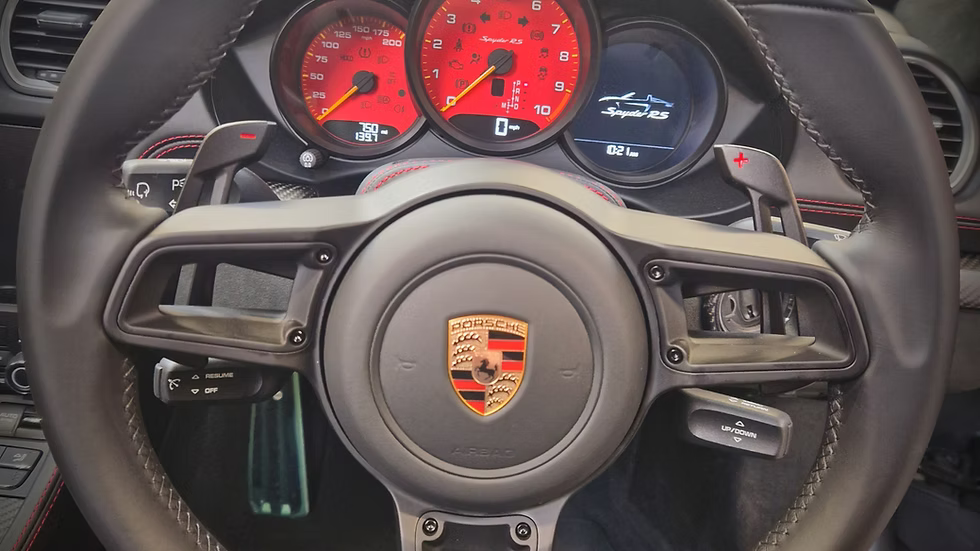 Precise and positive shift feel. The magnetic haptic elements derived from the setup 911 GT3 Cup give them an even crisper force-path curve. They allow a higher operating force and provide precise acoustic feedback for the switching point. The up and down shift icons are highlighted in yellow, red or blue on the paddles.