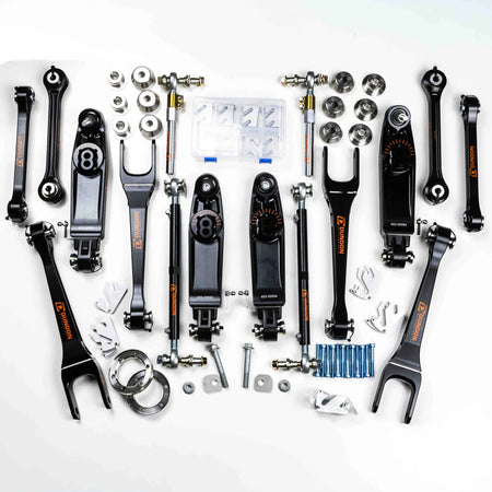 - Lower Control Arms use extended studs allowing for more shims and increased negative camber.