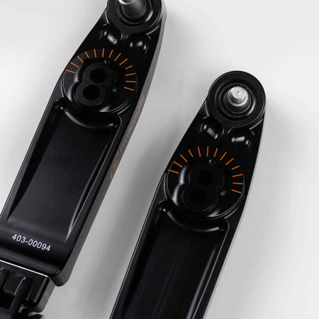 - Lower Control Arms use extended studs allowing for more shims and increased negative camber.