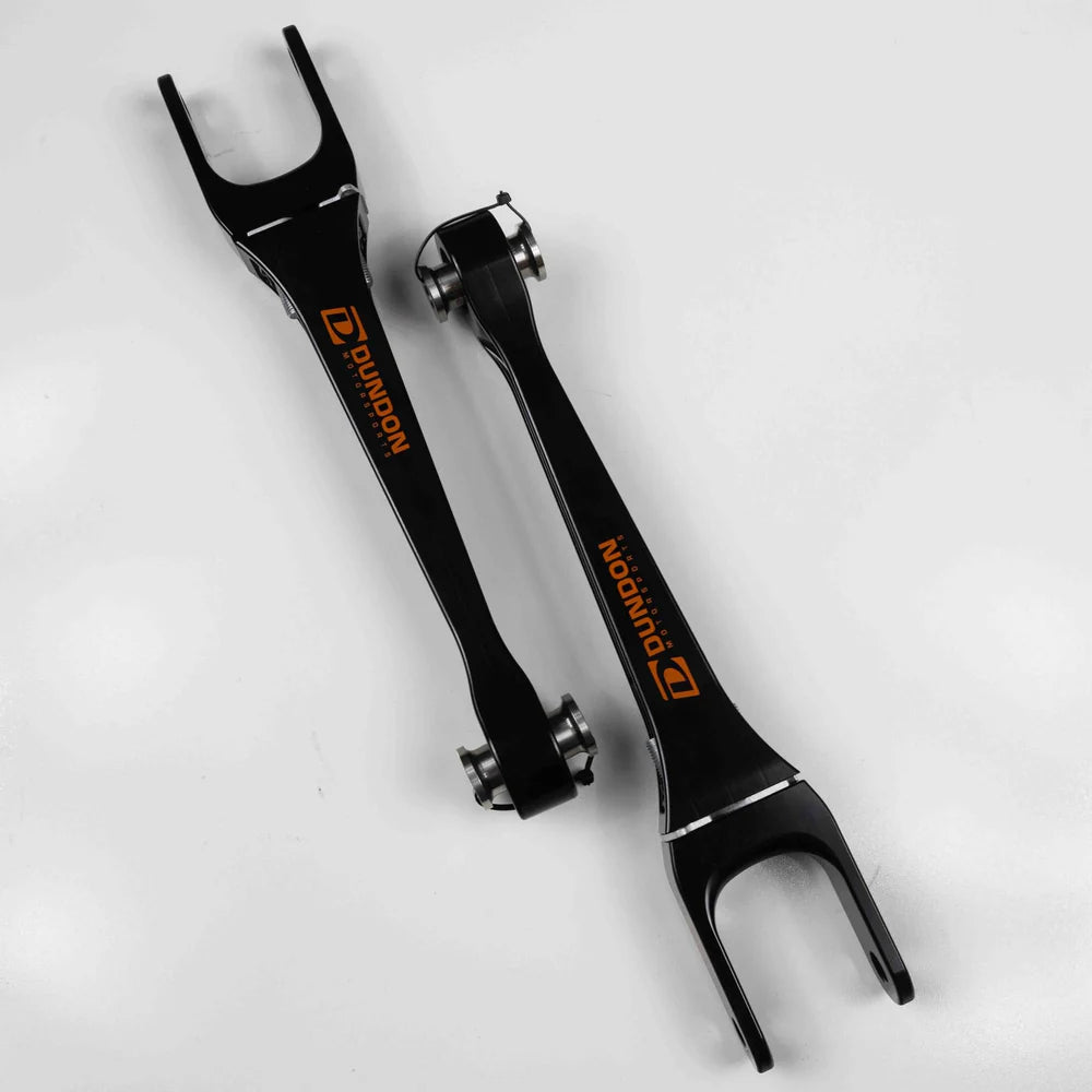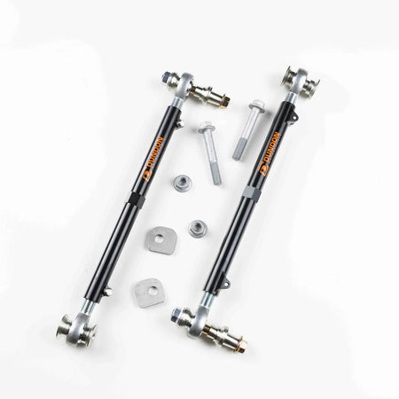 - Two-Piece Rear Lower Control Arms to increase track width and add negative camber (includes caster pucks)