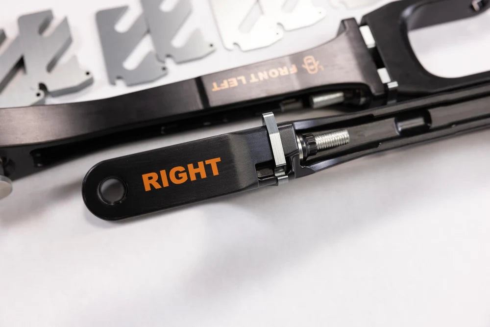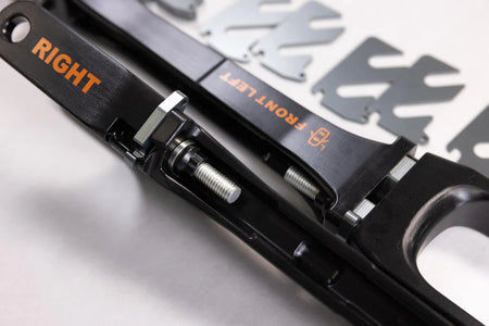 - Lower Control Arms use extended studs allowing for more shims and increased negative camber.