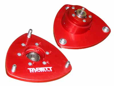 These camber plates replace the compliant factory rubber bushing with a precision Teflon-lined spherical bearing for increased front suspension rigidity, quicker steering response, and better handling.
